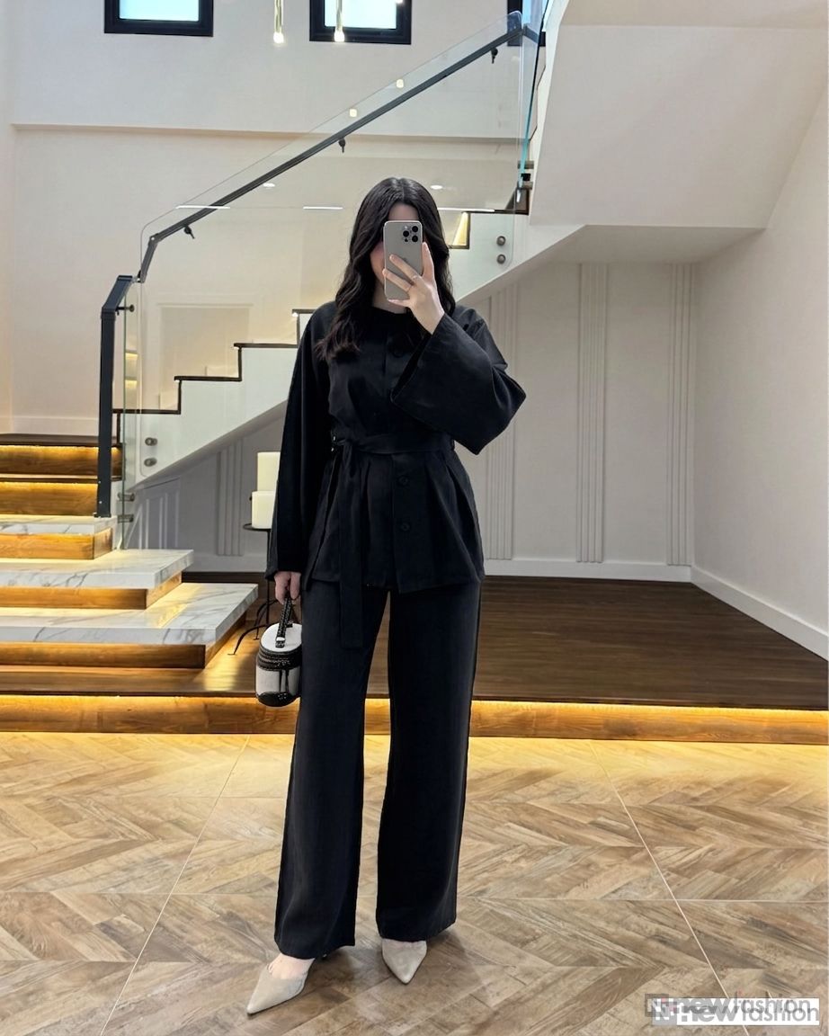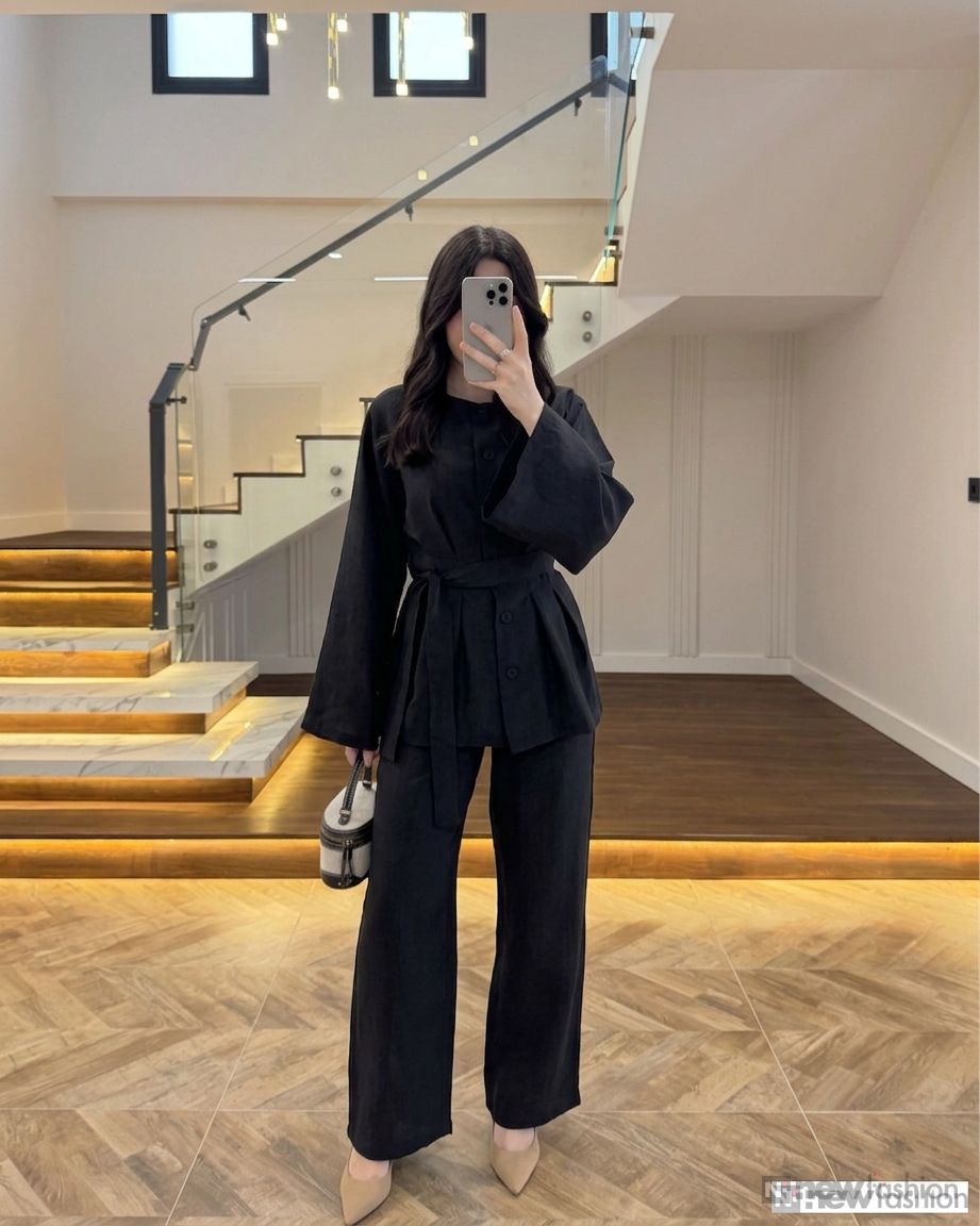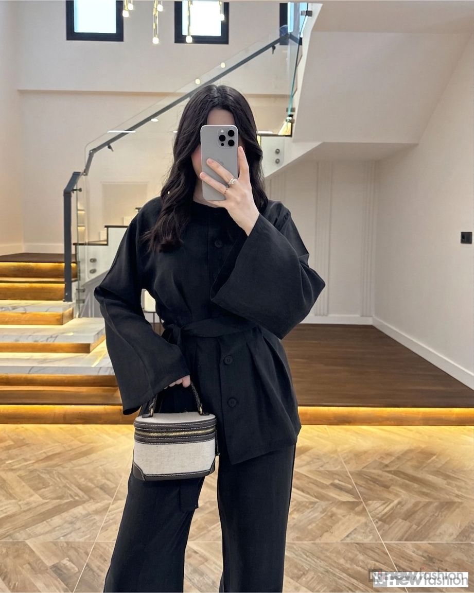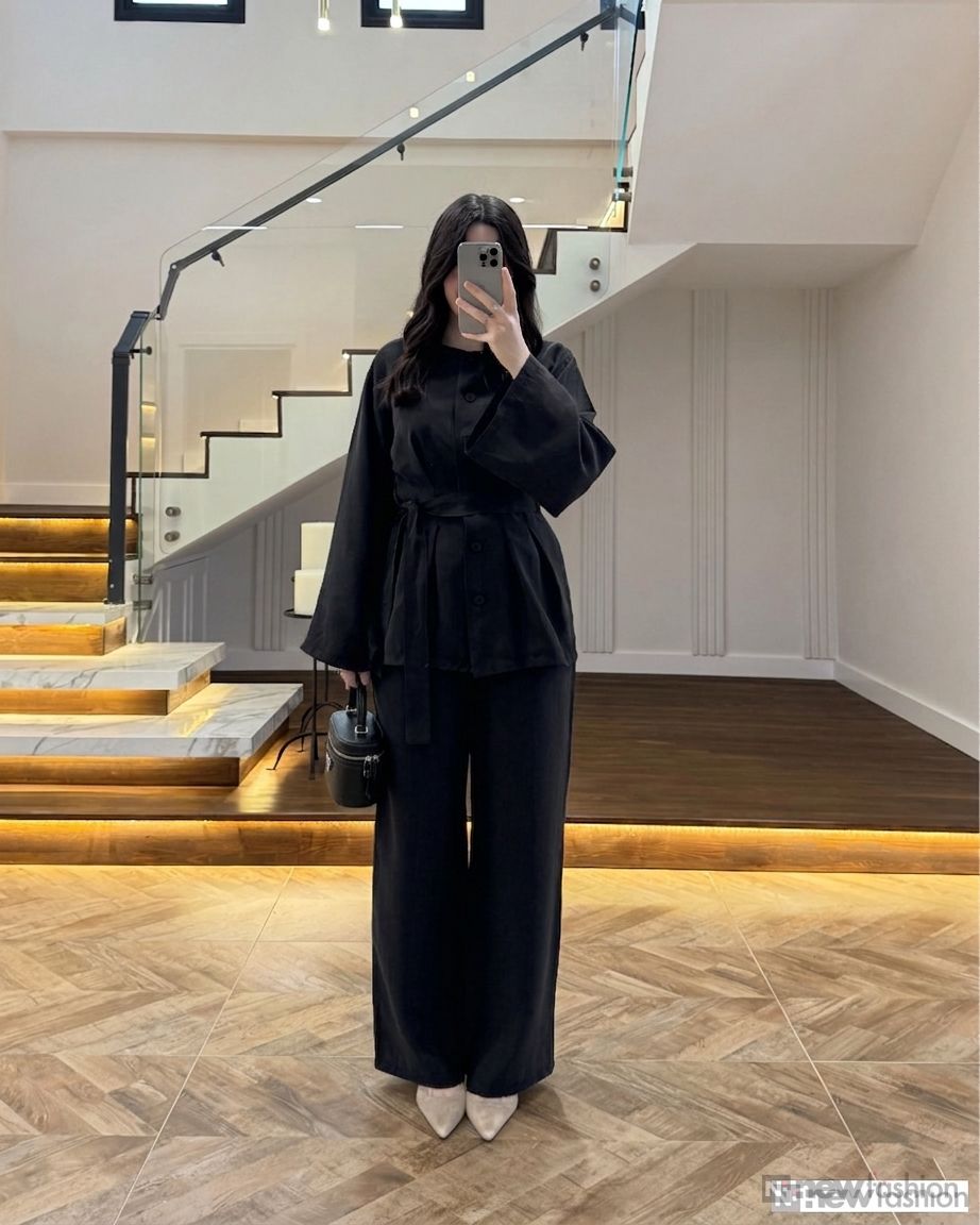 - القطعة العلوية: قميص أنيق مزود بأزرار أمامية عملية، وأكمام واسعة تمنحك حرية الحركة وشعوراً بالراحة، بالإضافة إلى حزام قماشي متناسق يمكن ربطه ليبرز جمال الخصر ويضفي لمسة أنثوية راقية.