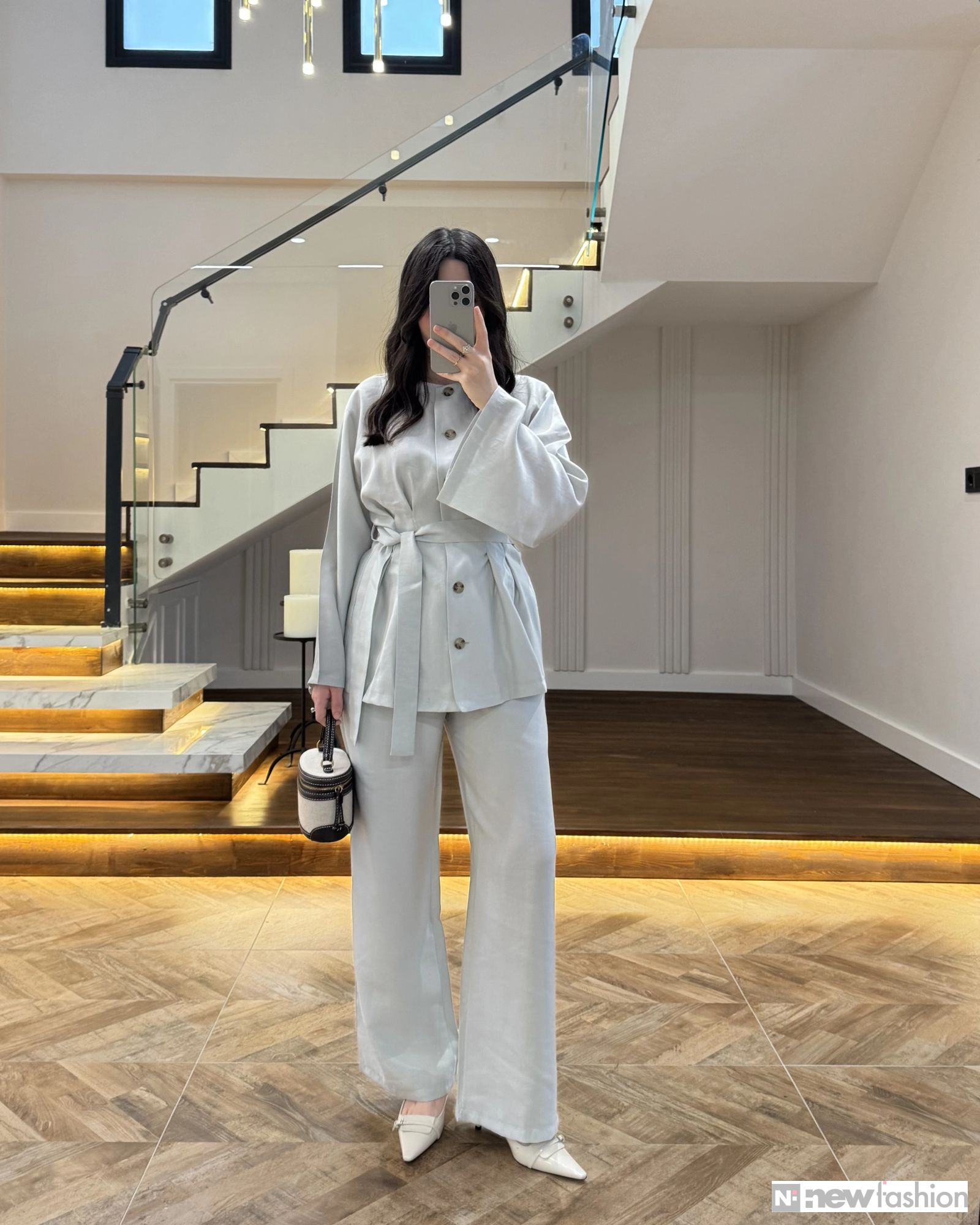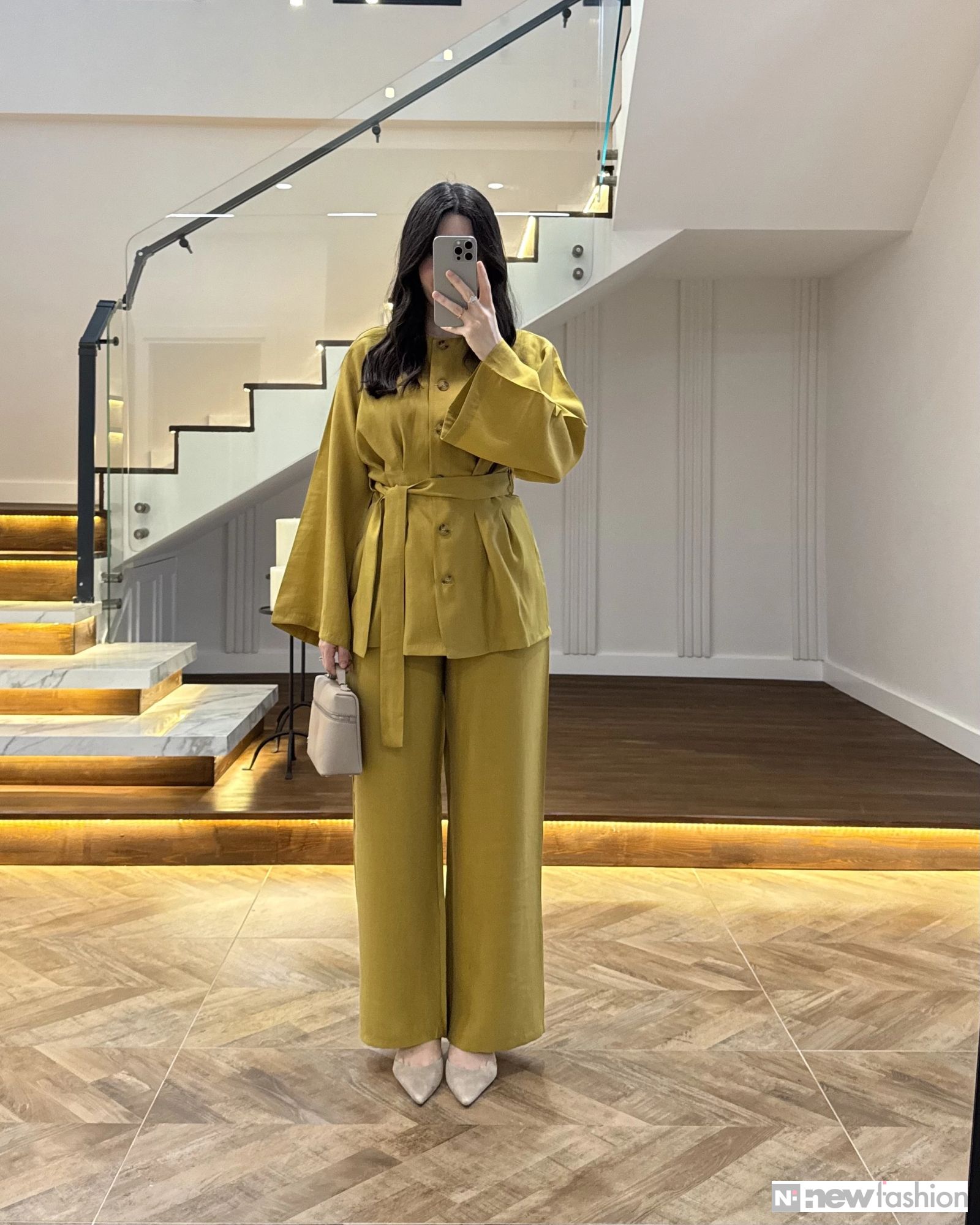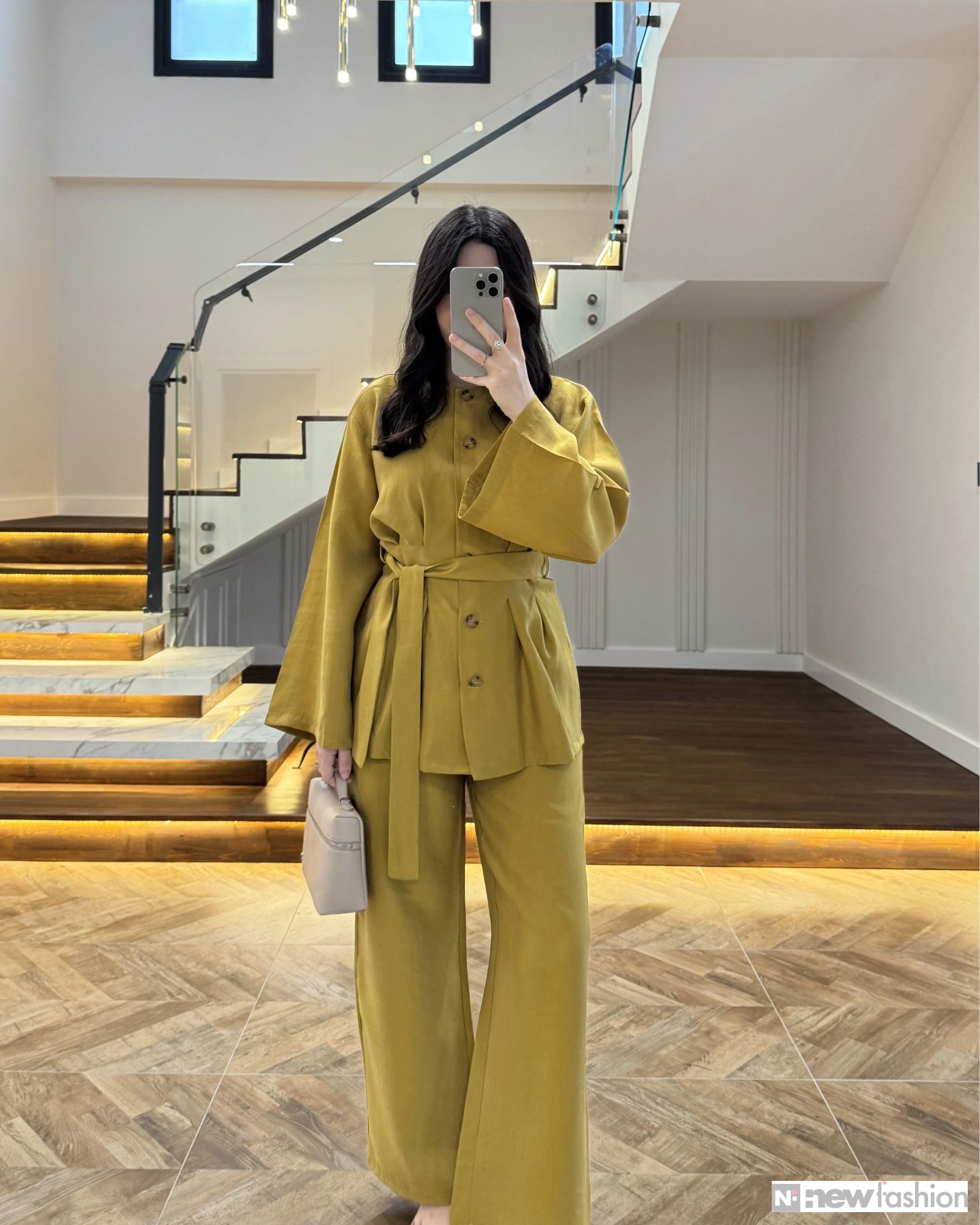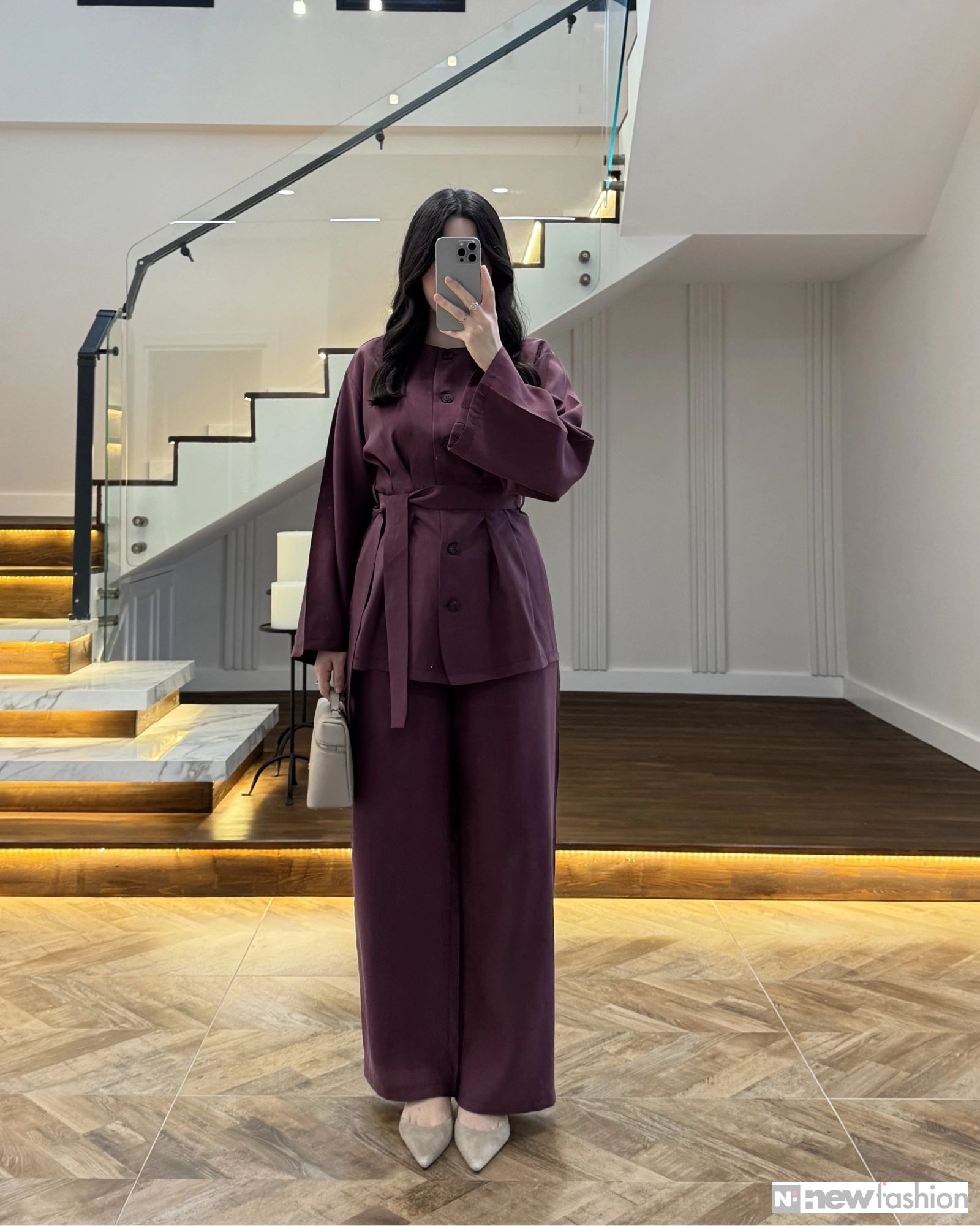 - القطعة العلوية: قميص أنيق مزود بأزرار أمامية عملية، وأكمام واسعة تمنحك حرية الحركة وشعوراً بالراحة، بالإضافة إلى حزام قماشي متناسق يمكن ربطه ليبرز جمال الخصر ويضفي لمسة أنثوية راقية.